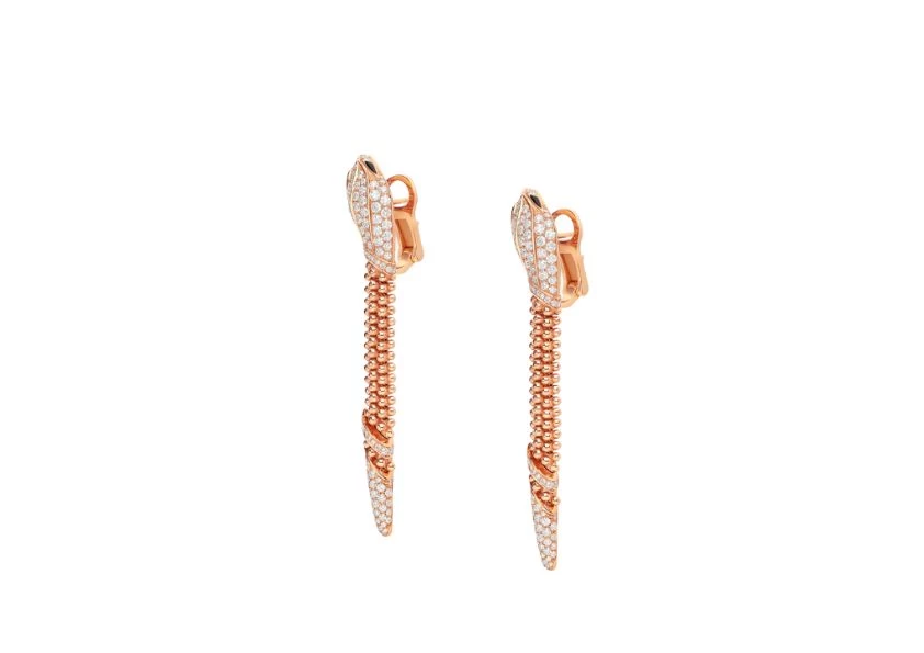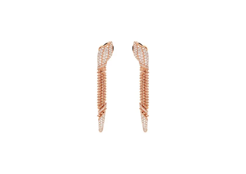 Crafted with meticulous attention to detail, the Serpenti earrings are a distinctive interpretation of Bulgari's renowned symbol of transformation and metamorphosis. The 18 kt rose gold beautifully showcases the snake's mesmerizing body, composed of delicate and movable gold beads that exude a sense of fluidity and tactile allure.