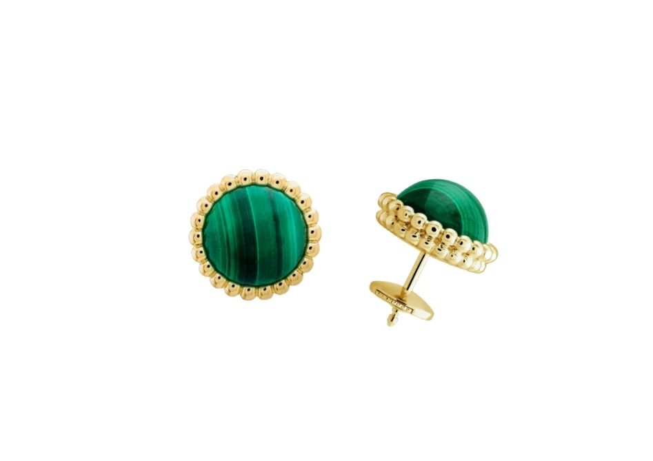 Introducing the exquisite Preloved: Perlée couleurs earrings by Van Cleef & Arpels. Crafted with utmost precision and elegance, these earrings are made from 18K yellow gold and adorned with stunning malachite stones.