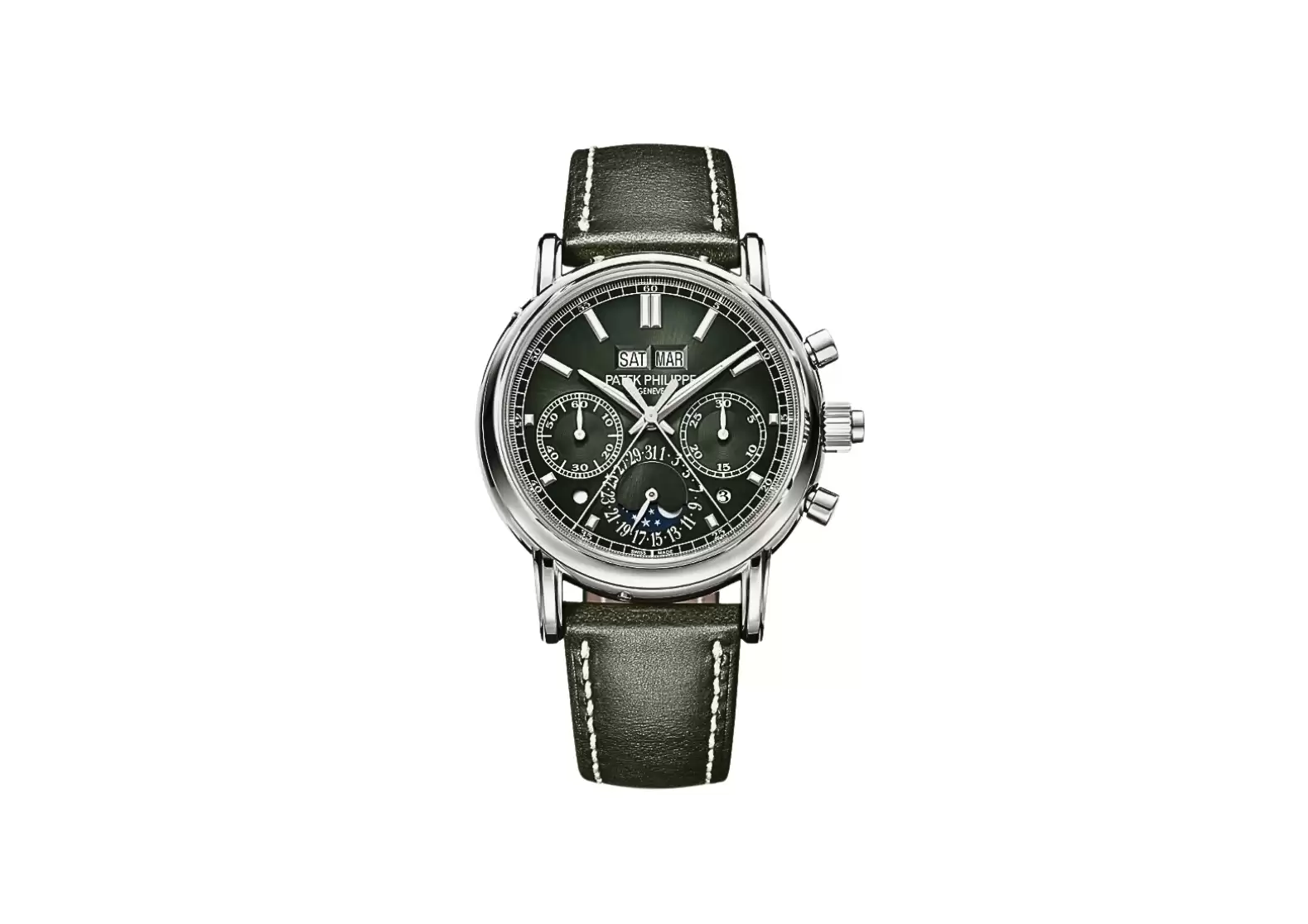 The Ref. 5204G-001 is a remarkable fusion of two of Patek Philippe's most sought-after complications: a split-seconds chronograph and a perpetual calendar. The instantaneous 30-minute counter, day, month, leap year, and day/night indication are displayed in apertures, while the date is indicated by hand. The moon phases and small seconds add a touch of sophistication to this already impressive watch.